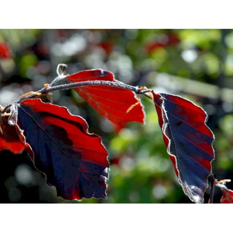 Bladene er ovale, lidt større end på almindelig bøg, og i udspring lysende rødvinsrøde, senere mere sortrøde.