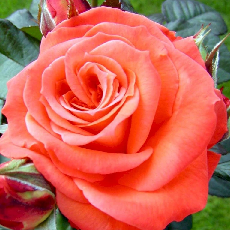 Orange til grenadinefarvet. Stor, velformet fyldt blomst med kraftig og dejlig, parfumeret duft. 25-40 kronblade. Op til 10 cm i diameter.