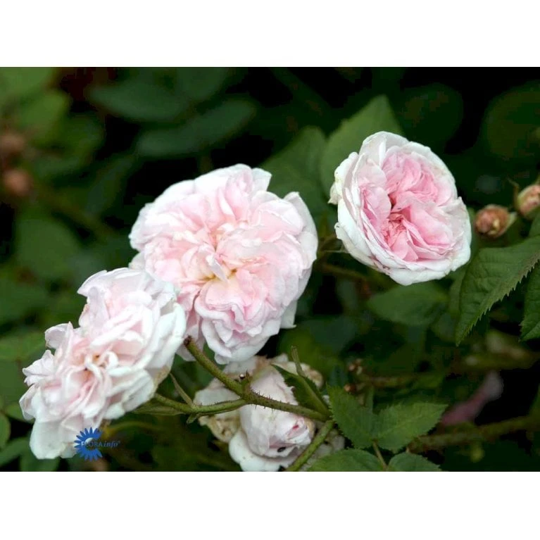 Meget kraftig og tæt vækst, med oprette hovedgrene og svagt buede sidegrene. Mørkt blågrønne blade i fin kontrast til den blege blomst. Næsten tornfri.