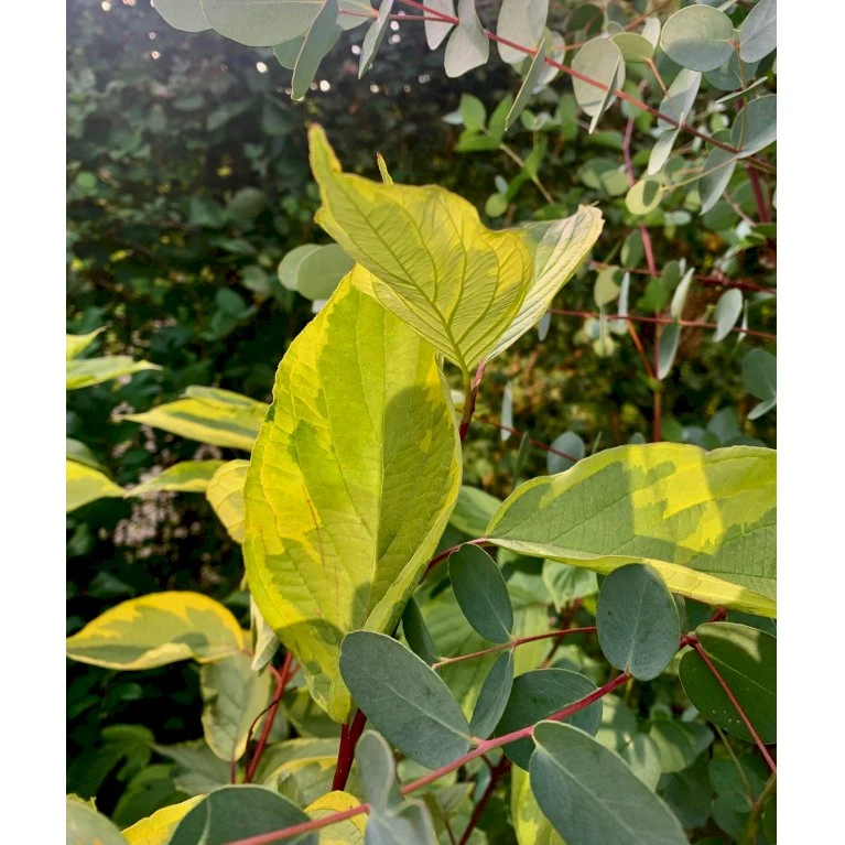Bladene er ovale med synlige nerver, friskgrønne i udspring og senere mørkegrønne med uregelmæssig limefarvet rand på alle blade.