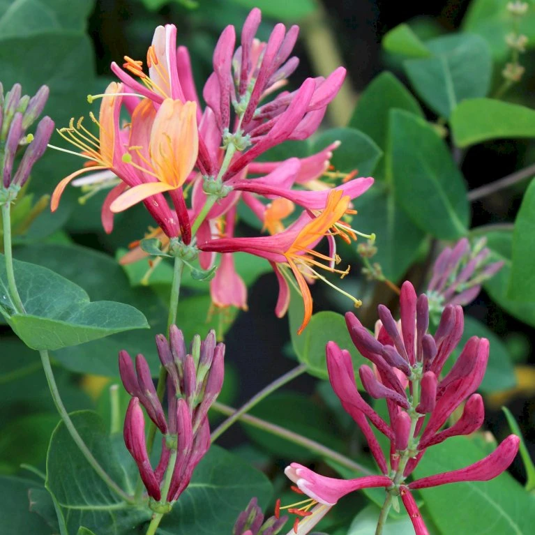 Lang blomstring, startende i juni, sluttende i september. Smukke og særprægede rørformede blomster, som sidder mange sammen. Blomsterne har let duft og er magentarøde til mørkerøde på ydersiden og på indersiden mørkegule til cremegule, undertiden med en rosa tone.